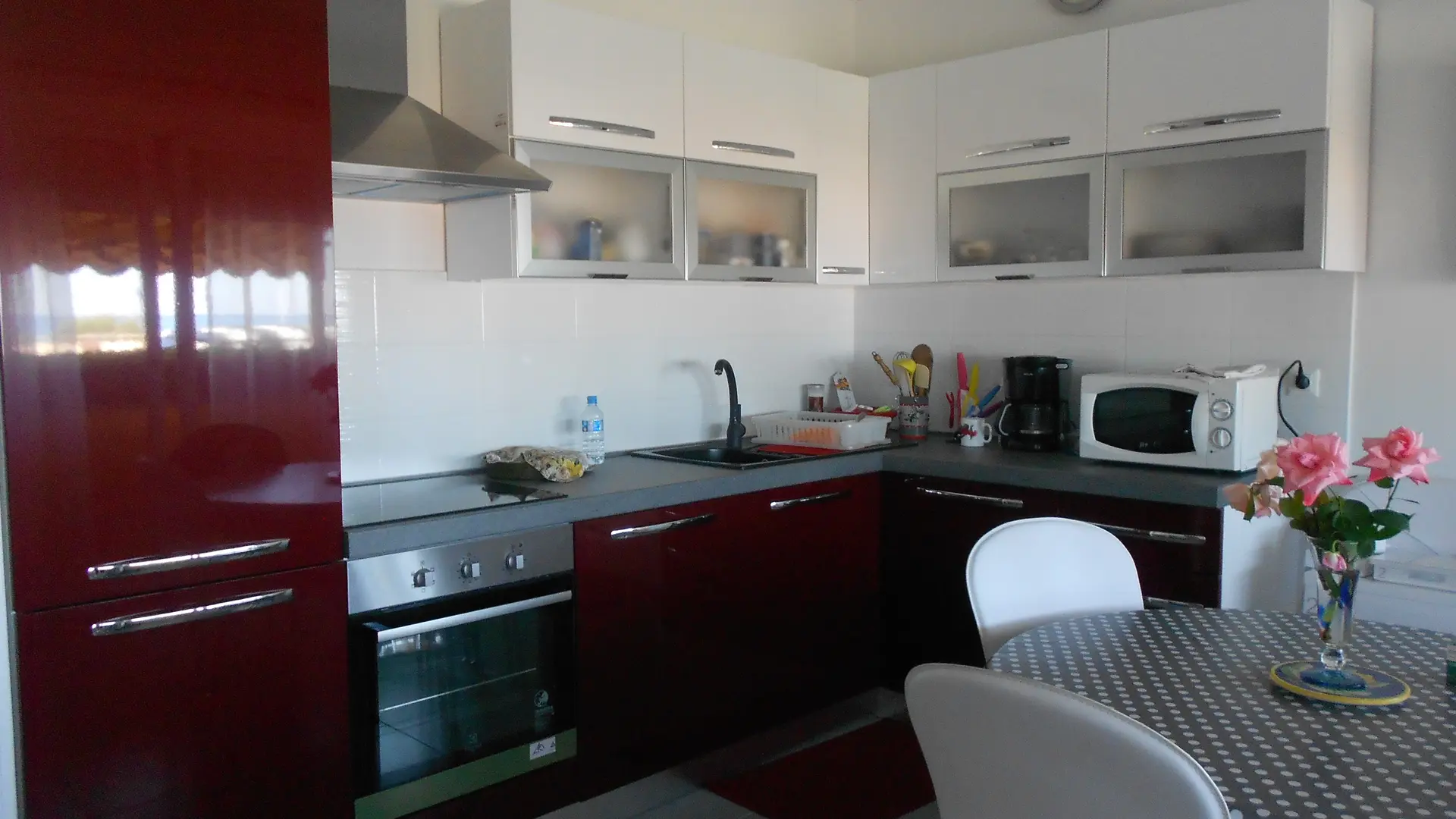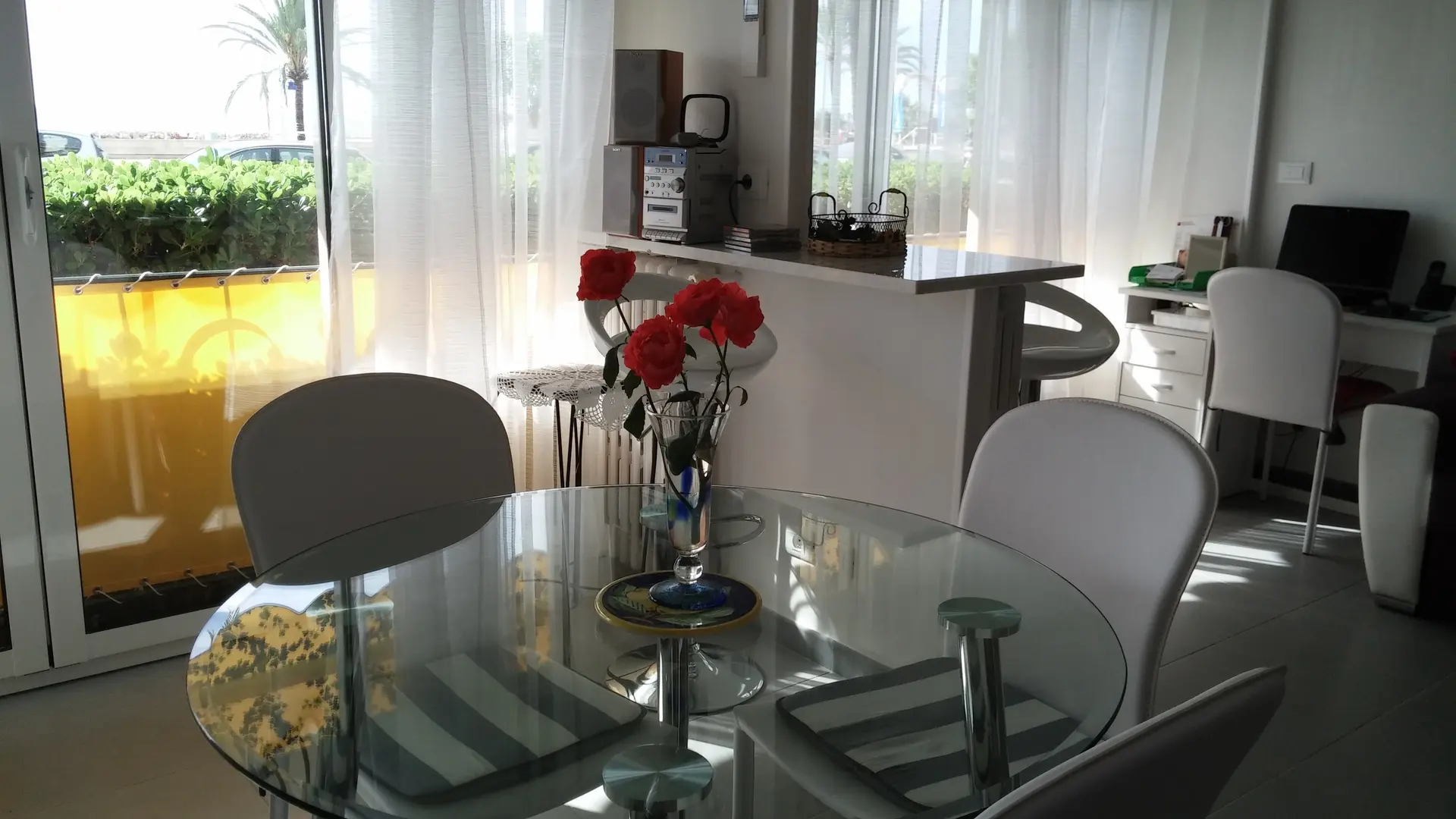 Appartamento 2 locali luminoso e spazioso in residenza tranquilla con grandi vetrate di fronte al mare. Terrazza sul retro rilassante e simpatico stile patio. Doccia moderna con doppio lavabo e lavatrice; bella cucina americana.