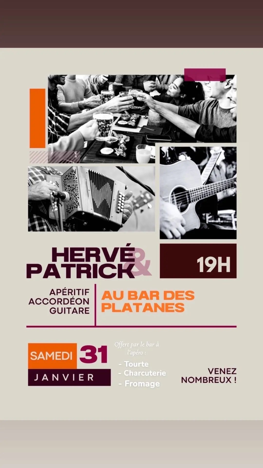 Il Bar des Platanes vi invita a un aperitivo musicale! Unitevi a Hervé e Patrick che vi intratterranno con le loro melodie di fisarmonica e chitarra. Il bar servirà una selezione di torte, salumi e formaggi per accompagnare questa serata conviviale. Venite tutti a condividere questo momento di relax e di piacere.