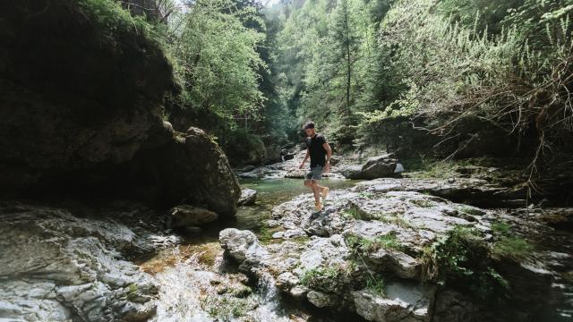 Di nuovo in Francia, la discesa può cominciare. Fin dalla partenza, si aderisce bene alla roccia calcarea e l’acqua limpida consente di verificare la profondità. Si procede con sicurezza. Tutti i salti si possono aggirare, ma i bambini non si fanno pregare: scivoli naturali, tuffi, cascate… La temperatura dell’acqua è di quasi 20° e la vegetazione lascia ampiamente filtrare i raggi del sole. Non è fredda!